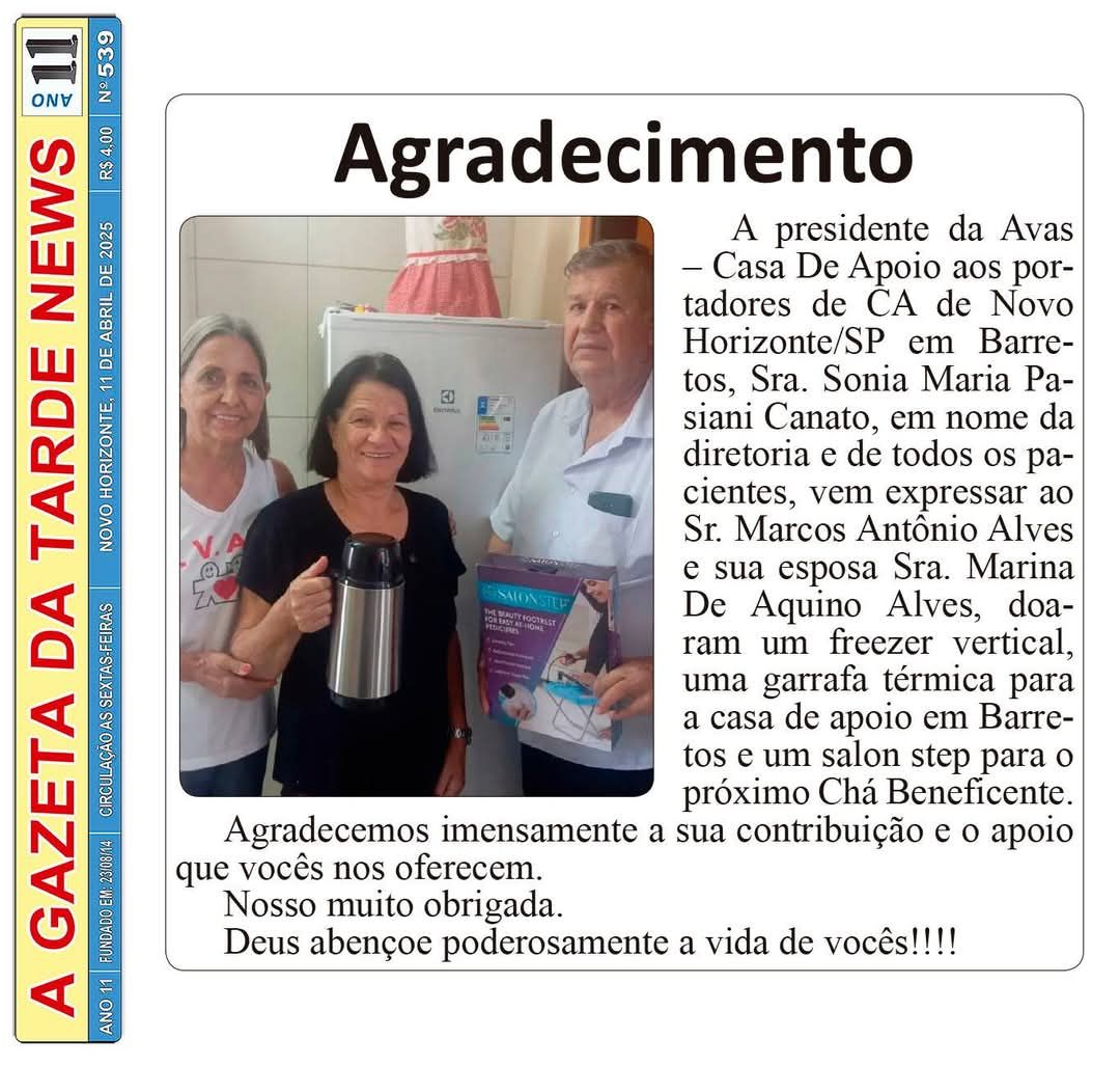 A AVAS agradece o JORNAL A GAZETA DA TARDE NEWS - 11 de abril de 2025, pelo agradecimento ao casal Sr. Marcos e Sra Marisa pela doação do freezer vertical para a casa